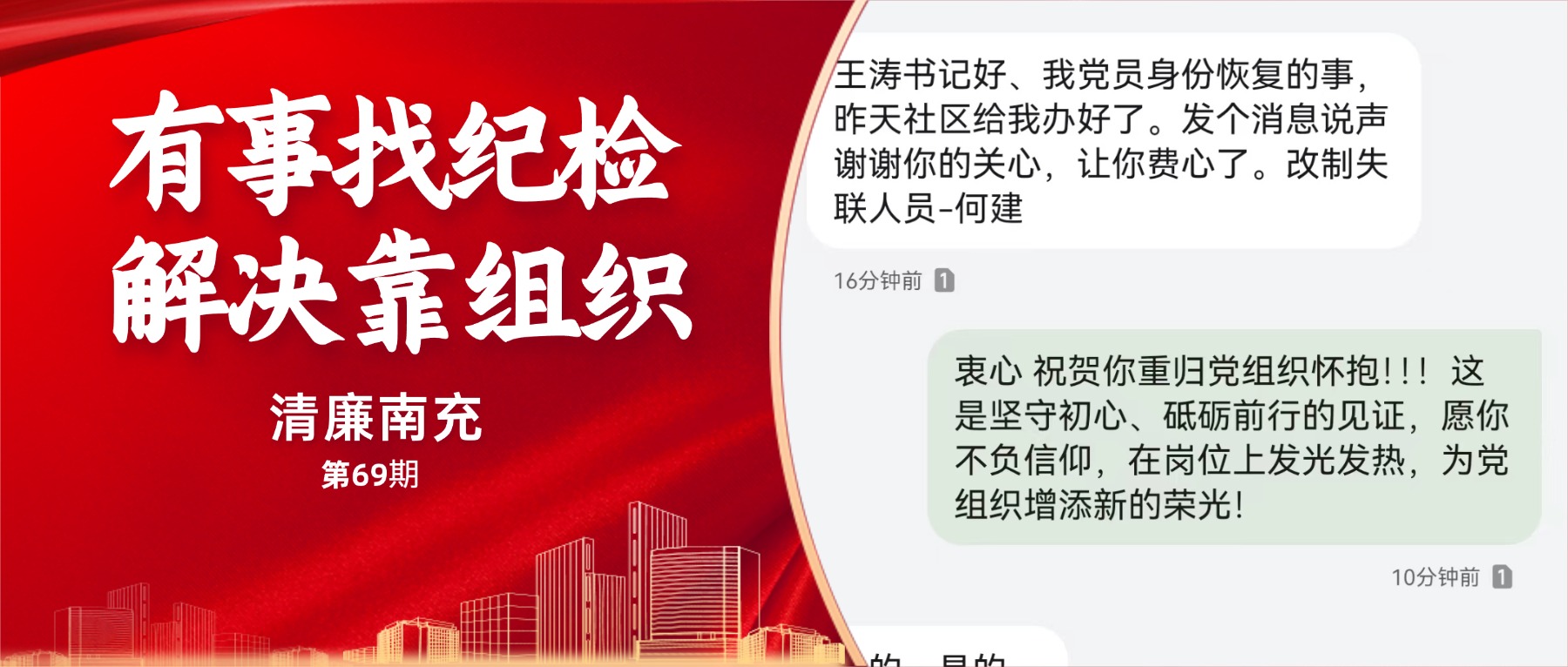近期,顺庆区西城街道纪工委书记王涛的手机上,收到了一条特别的短信。“王涛书记,我恢复党员身份的事,已经办好了!...