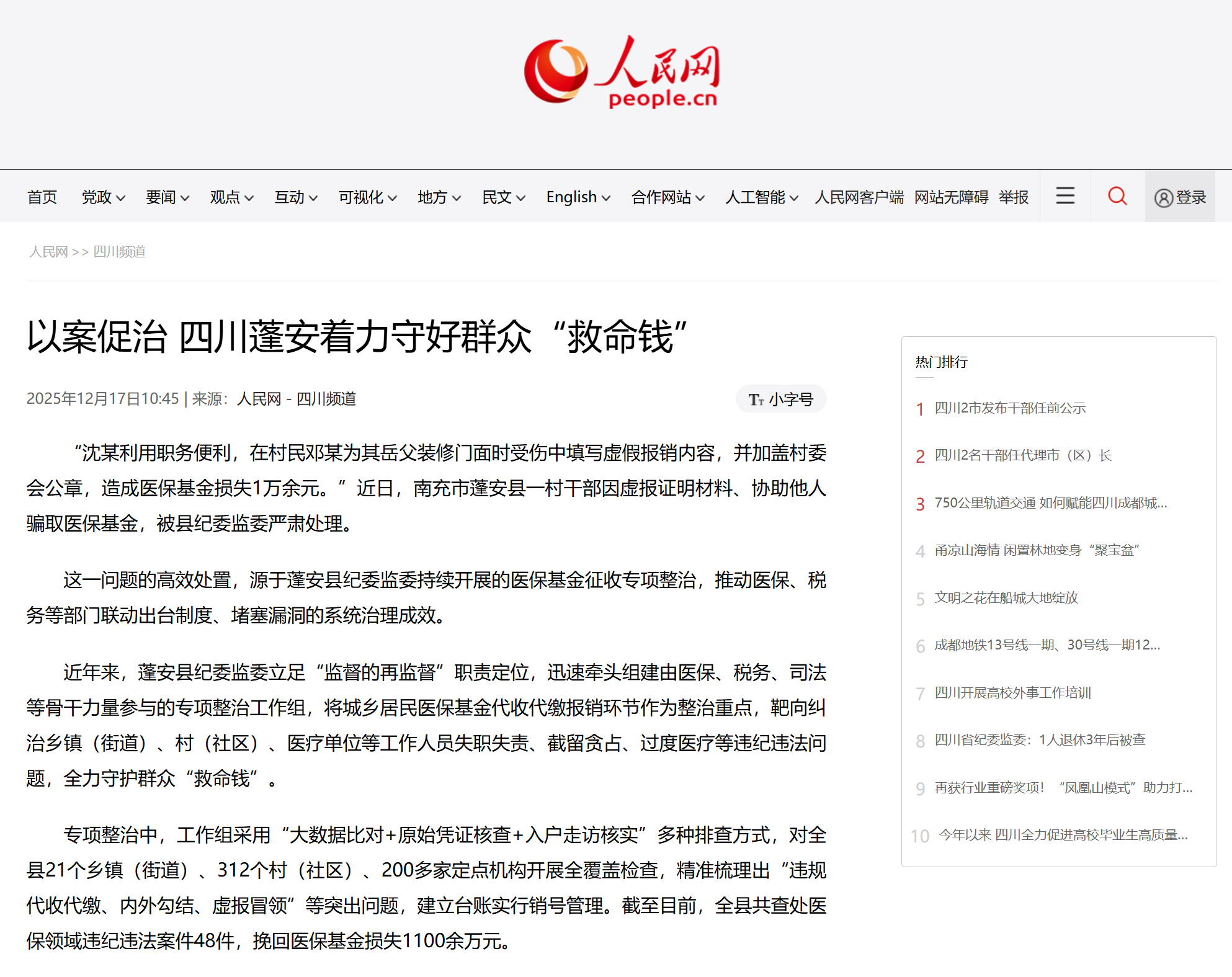 这一问题的高效处置,源于蓬安县纪委监委持续开展的医保基金征收专项整治,推动医保、税务等部门联动出台制度、堵塞漏洞的系统治理成效。