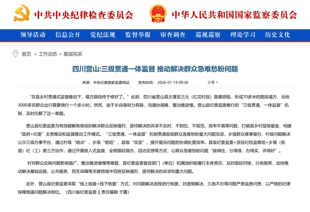 “在县乡村贯通式监督推动下,塌方路段终于修好了。”此前,四川省营山县太蓬至三元(红花村段)路基损毁,形成70多米的路段塌方,当地3000多名群众出行需要绕行一个多小时。然而,由于乡自身财力有限,沟通协调难,整治推进慢。营山县纪委监委推行的“三级贯通、一体监督”机制,及时化解了这一难题。