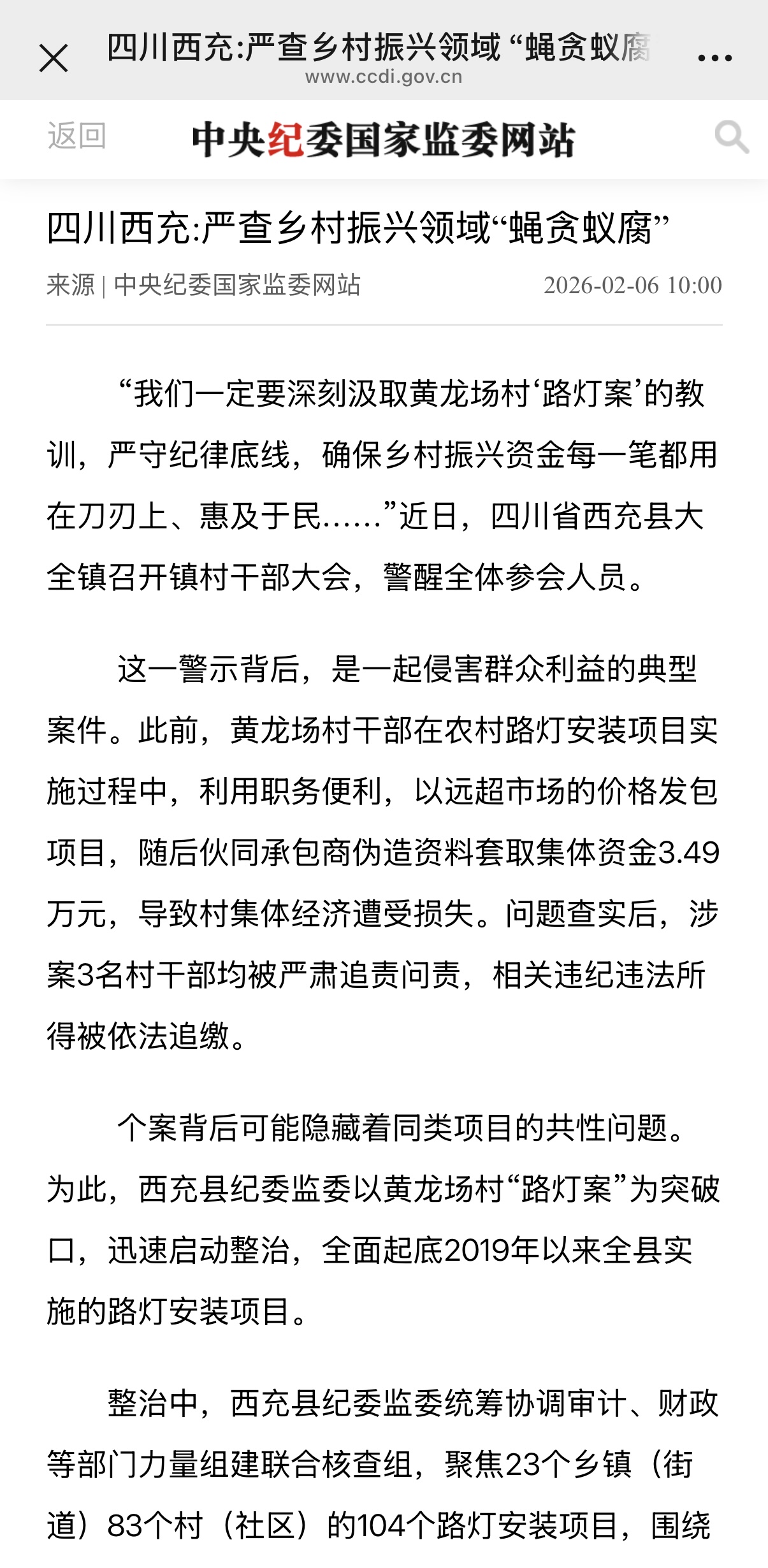 个案背后可能隐藏着同类项目的共性问题。为此,西充县纪委监委以黄龙场村“路灯案”为突破口,迅速启动整治,全面起底2019年以来全县实施的路灯安装项目。