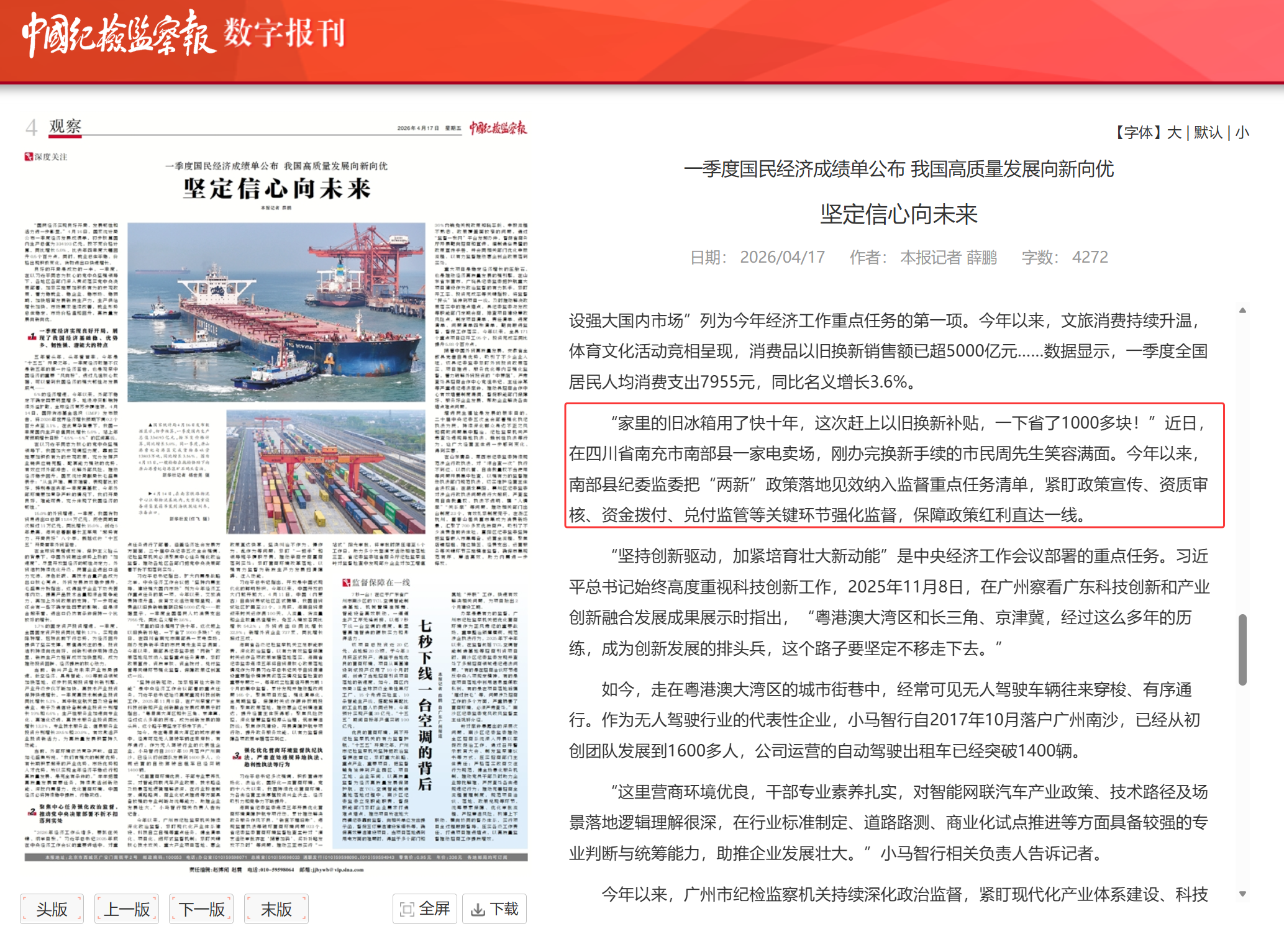 “家里的旧冰箱用了快十年,这次赶上以旧换新补贴,一下省了1000多块!”近日,在四川省南充市南部县一家电卖场,刚办完换新手续的市民周先生笑容满面。今年以来,南部县纪委监委把“两新”政策落地见效纳入监督重点任务清单,紧盯政策宣传、资质审核、资金拨付、兑付监管等关键环节强化监督,保障政策红利直达一线。