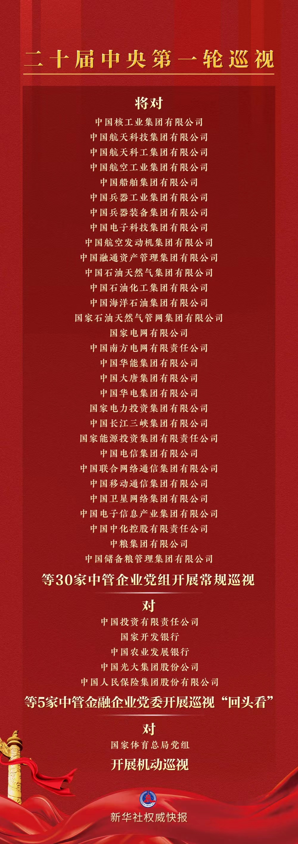 经党中央批准,二十届中央第一轮巡视将对中国核工业集团有限公司、中国航天科技集团有限公司、中国航天科工集团有限公司、中国航空工业集团有限公司、中国船舶集团有限公司、中国兵器工业集团有限公司、中国兵器装备集团有限公司、中国电子科技集团有限公司、中国航空发动机集团有限公司、中国融通资产管理集团有限公司、中国石油天然气集团有限公司、中国石油化工集团有限公司、中国海洋石油集团有限公司、国家石油天然气管网集团有限公司、国家电网有限公司、中国南方电网有限责任公司、中国华能集团有限公司、中国大唐集团有限公司、中国华电集团有限公司、国家电力投资集团有限公司、中国长江三峡集团有限公司、国家能源投资集团有限责任公司、中国电信集团有限公司、中国联合网络通信集团有限公司、中国移动通信集团有限公司、中国卫星网络集团有限公司、中国电子信息产业集团有限公司、中国中化控股有限责任公司、中粮集团有限公司、中国储备粮管理集团有限公司等30家中管企业党组开展常规巡视;对中国投资有限责任公司、国家开发银行、中国农业发展银行、中国光大集团股份公司、中国人民保险集团股份有限公司等5家中管金融企业党委开展巡视“回头看”;对国家体育总局党组开展机动巡视。