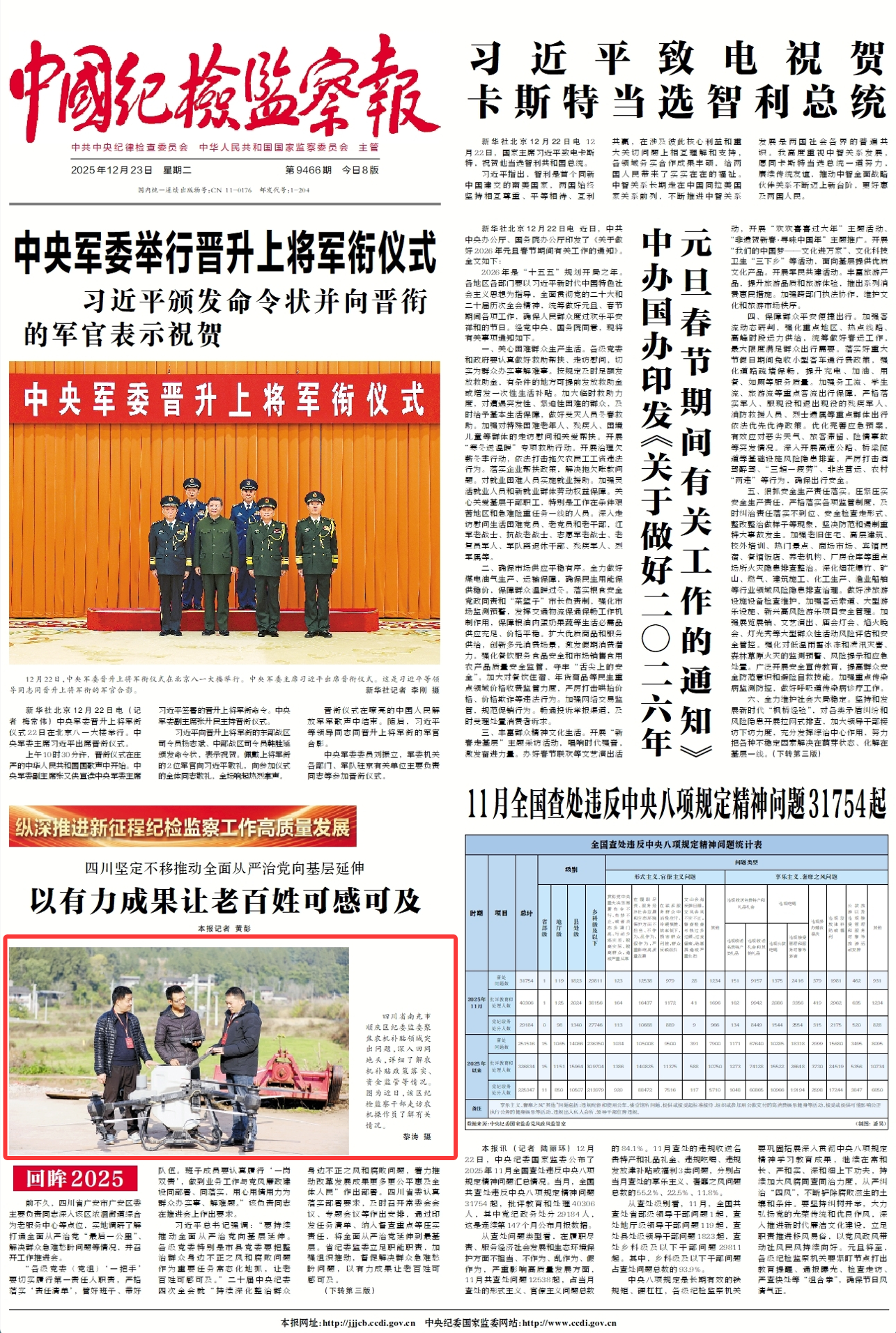 2025年12月23日,《中国纪检监察报》头版刊发《回眸2025——四川坚定不移推动全面从严治党向基层延伸 以有力成果让老百姓可感可及》。