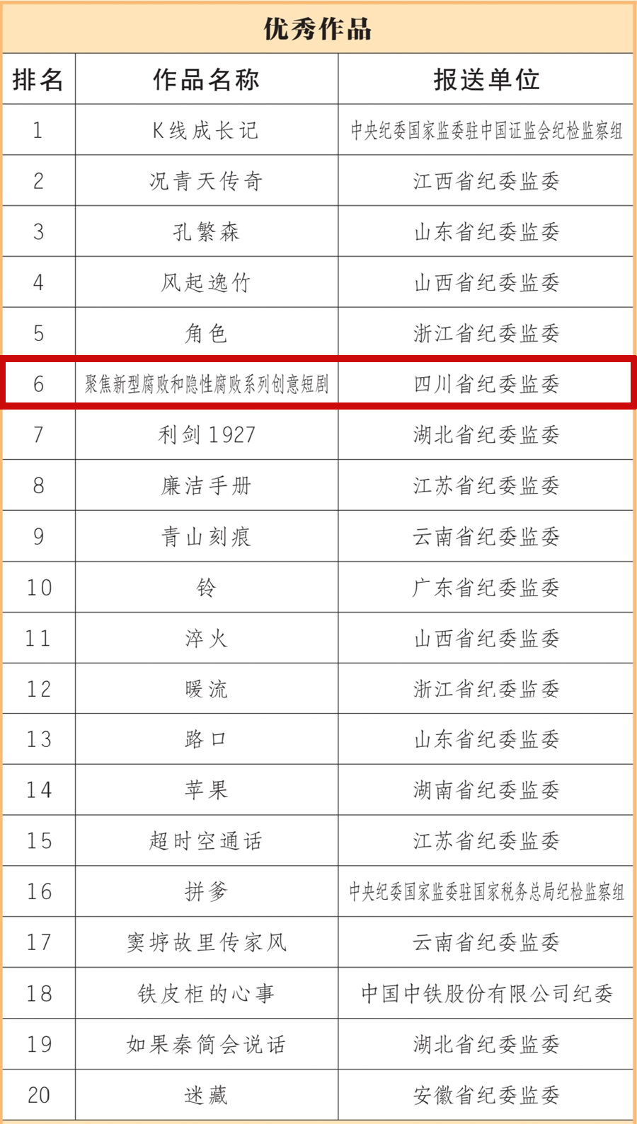 近日,由中央纪委国家监委宣传部、中央宣传部文艺局、中央网信办网络传播局联合主办,人民网承办的新时代廉洁文化微短剧征集展播活动,公布了20部优秀作品、40部入围作品(名单附后)。