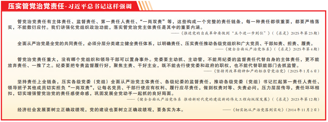 根深则叶茂,本固则枝荣。高质量发展需要高质量党建来引领。把党建设好了,我们的国家、我们的人民、我们的事业就有了主心骨。如果我们党弱了、散了、垮了,其他政绩又有什么意义呢?2025年6月,习近平总书记在二十届中央政治局第二十一次集体学习时指出,“我曾经说过,抓好党建是本职,不抓党建是失职,抓不好党建是不称职,现在看来这大有重申的必要”。抓发展和抓党建要结合起来,各级党委要把从严治党责任承担好、落实好,坚持党建工作和中心工作一起谋划、一起部署、一起考核,把每条战线、每个领域、每个环节的党建工作抓具体、抓深入,坚决防止“一手硬、一手软”。对各级各部门党组织负责人特别是党委(党组)书记的考核,首先要看抓党建的实效,考核其他党员领导干部工作也要加大这方面的权重。