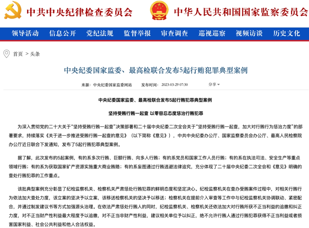 在3月29日,中央纪委国家监委、最高检联合发布5起行贿犯罪典型案例。