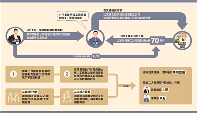 其中,2011年,沈德明利用担任苏州监狱党委书记、监狱长的职务便利,要求苏州监狱相关工程的承建单位某国资公司将某门窗安装工程项目交给沈某承接。沈某并不具备承接工程项目的资金、资质和能力,在沈德明安排下,沈某将某门窗安装工程项目交给某施工公司,沈德明要求沈某与某施工公司约定好处费。2014年至2017年,沈某从某施工公司获取好处费70万元,沈德明对此予以认可。