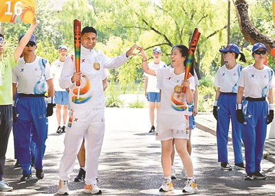 6月10日,第三十一届世界大学生夏季运动会火炬传递在京举行。图为火炬手艾克森(前左)与杨倩(前右)在火炬传递中交接。 新华社发