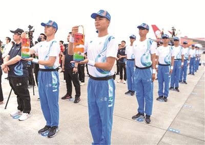 6月8日,在成都天府国际机场,护卫队队员手持成都大运会火种灯。 新华社记者 王曦 摄