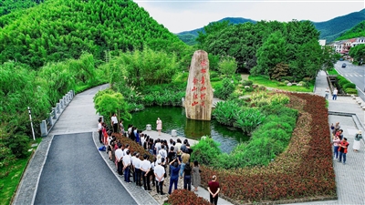 在浙江省安吉县天荒坪镇余村,“绿水青山就是金山银山”理念已深入人心,为了进一步宣传好这一理念,余村专门组成了“余村故事”讲解团。图为近日,“余村故事”讲解团成员在“绿水青山就是金山银山”石碑前为游客讲述余村的发展故事。殷兴华 摄