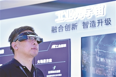 图②:第十八届中国国际中小企业博览会上,戴上AR眼镜的工作人员正在展示“工业元宇宙”的应用。图片来源:视觉中国