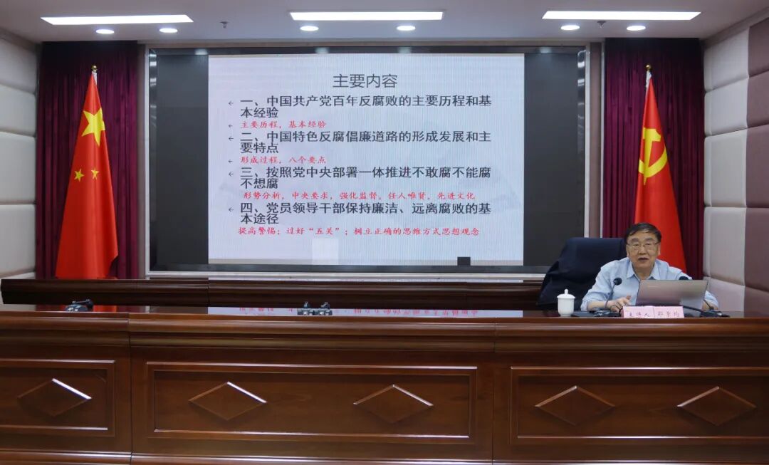 6月1日,市纪委监委开展党史学习教育集中学习会。北京市习近平新时代中国特色社会主义思想研究中心特聘专家、研究员邵景均应邀作题为《学习党的百年反腐败经验,走好中国特色反腐倡廉道路》的专题辅导。 邵景均正对相关内容进行深入浅出地系统讲解。 学习会上,邵景均重点围绕中国共产党百年反腐败的主要历程和基本经验,中国特色反腐倡廉道路的形成发展和主要特点,一体推进不敢腐、不能腐、不想腐,党员干部保持廉洁、远离腐败的基本途径等方面进行了深入浅出地系统讲解。 讲座主题鲜明,内容丰富,既有理论高度,更具工作实操性和指导性,让参训干部获益匪浅。大家一致表示,以高度的政治自觉做好党史学习,学有所思、学有所行、学有所获,以实际行动为党百岁生日献礼。 会议强调,要持续在“学与思”上下功夫,把学习教育贯穿始终。用好“间周一学习研讨”“考学评学督学问学”制度,坚持原原本本学、贯通系统学、聚焦重点学。 要持续在“学与改”上下功夫,把对标补短贯穿始终。对照百年党史中的先进人物、宝贵精神对标补短,发扬红色传统、传承红色基因,提升党性修养、锤炼过硬作风。 要持续在“学与行”上下功夫,把为民办事贯穿始终。真正沉下去、摸实情、解难题,督办解决民生领域突出问题、不断深化系统治理、做细做实群众监督、坚决有力惩贪治腐。 要持续在“学与干”上下功夫,把学用结合贯穿始终。把学习成效转化为工作动力,持续抓好换届风气监督、政法队伍教育整顿、系统治理等重点工作,不断推动纪检监察工作高质量发展,切实做到“两不误、两促进”。